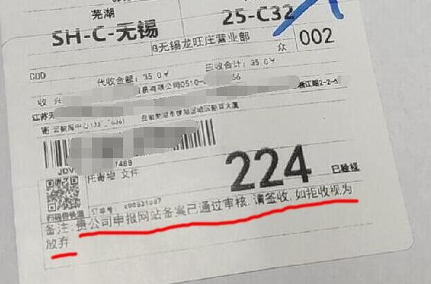 近期有用户反映收到来自安徽芜湖的快递件(顺丰和京东),信件到付35元,信件备注中写着:贵公司申报网站备案已通过审核,请签收,如拒收视为放弃。该邮件为诈骗行为,近期完成备案审核的用户请不要支付、签收!