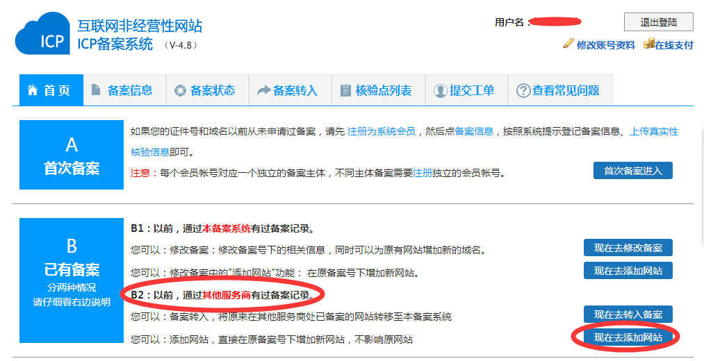 如果您在备案过程中遇到之前做过网站备案,但是由于时间久也找不到之前备案公司了或者别的原因需要更换备案点的,现在可以不用那么麻烦去转入之前备案再增加备案了,只需在新的备案平台注册,例如我们的西部数码备案中心,您可以直接选择增加备案即可,之前备案信息无影响,只需添加新的备案信息就可审核,图下图选择B备案,直接添加即可: