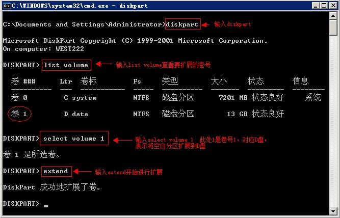 extend 回车(表示将余下的空间全部增加到D盘)